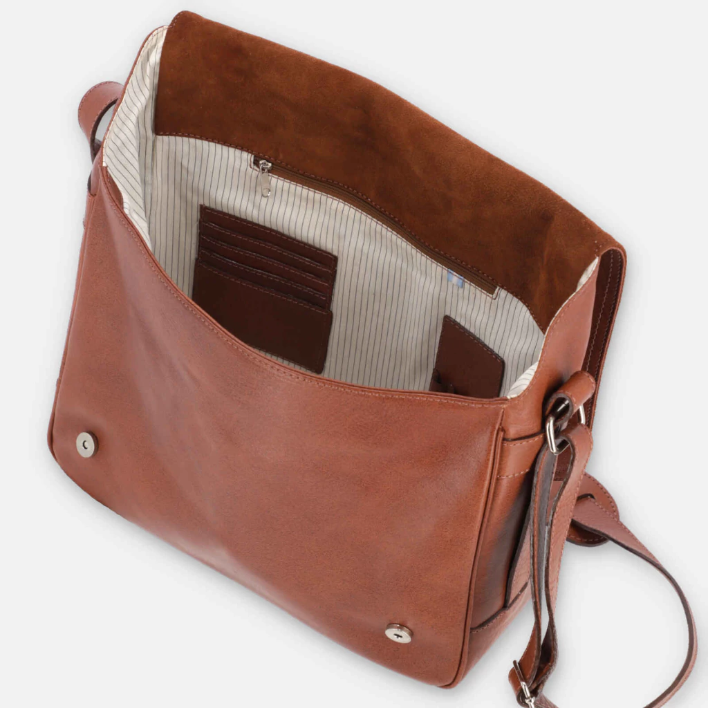 👜 Correa: bandolera de cuero regulable con mosquetones laterales; ajuste preciso para llevar cruzado sin abultar.