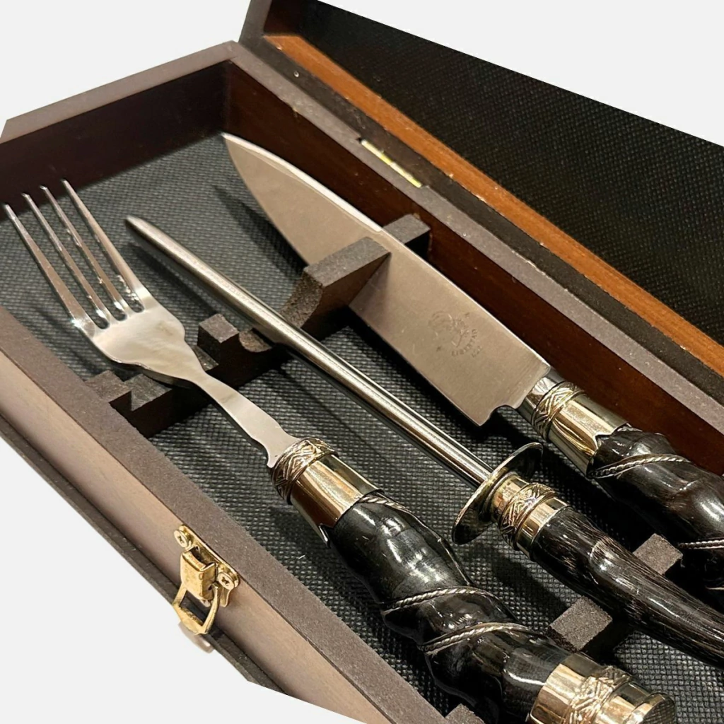 - Set de cuchillo y tenedor confeccionado artesanalmente en asta de antilope y alpaca.